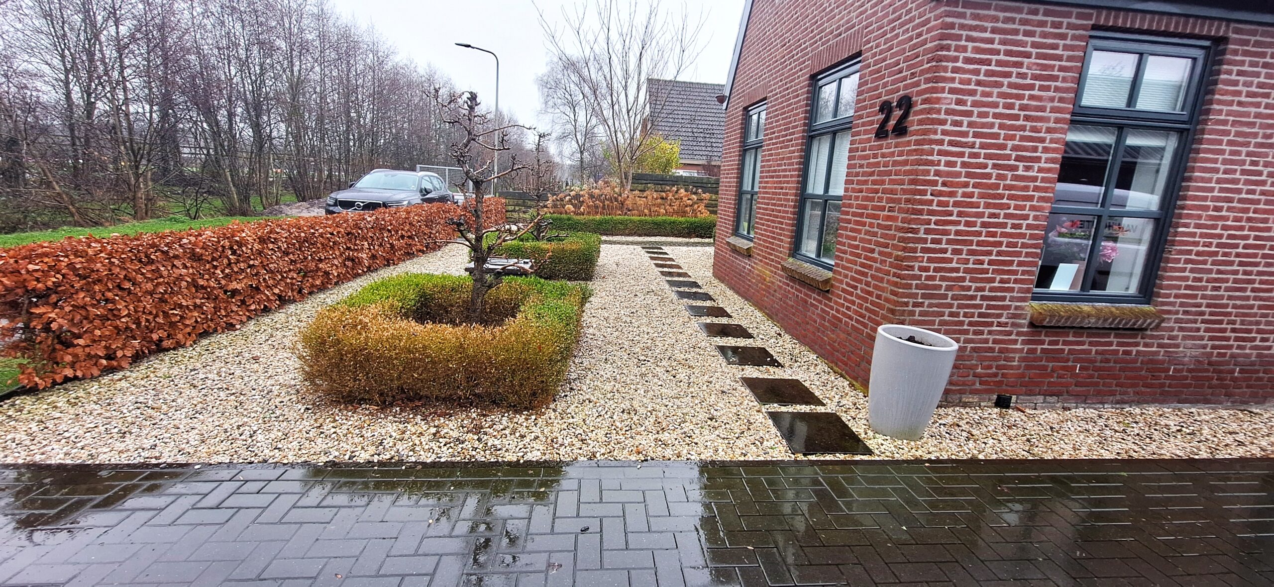 In juni 2024 is deze voortuin aangelegd. De buxus ging ten onder aan de buxusmot. Het grind was verouderd en hier en daar veel te veel. Kortom de tuin kon wel een update gebruiken. De haag voor en bomen zijn behouden. Hortensia’s en perenbomen zijn opgepot en weer terug geplaatst.